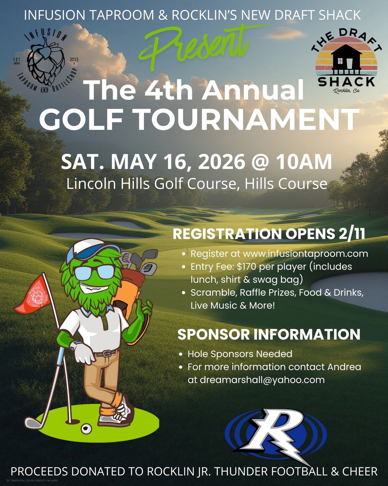 logo/name on hole sign, logo/name on welcome banner, logo/name on Infusion social media, logo/name on Rocklin Jr. Thunder social media